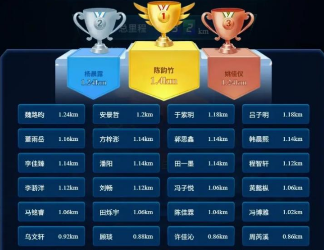 作为学校体育教育与德育、科技深度融合的创新实践,本次活动亮点纷呈:每周公示的班级总跑量、学生达标率、全员参与率, 不仅点燃了班级间的良性竞争, 更通过“ 一二· 九爱国 奔跑” 主题图 标三阶 段点亮 机 制 —— 第一周 参与率 ≥70% 点亮1/3 火焰,第二周总跑量提升 20% 点亮 2/3 火焰,第三周再提升 20% 解锁完整图标与 “爱国奔跑先锋班”荣誉,让集体荣誉感与爱国情怀深度绑定。此外,学校还设置了“阳光奔跑达标班”“ 奔跑达人”“ 坚持之星” 等多层次奖项, 既表彰集体协作的成果, 也鼓励个人意志的突破,让每个学生都能在活动中收获成长。